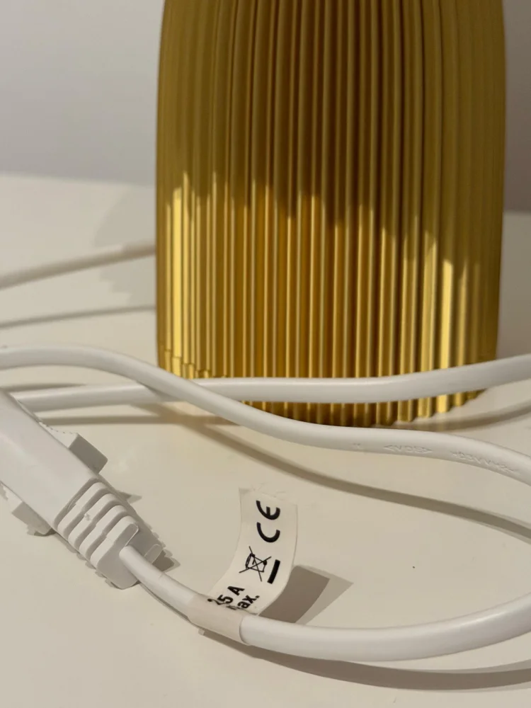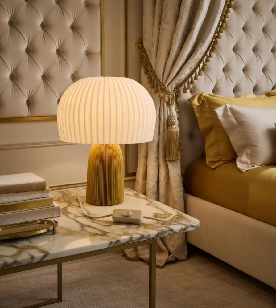 Ciuperca Aurie Plisată – veioză de lux imprimată 3D din PLA Gold 24K (bază cu efect auriu strălucitor) și abajur PLA silk mătăsos. Cablu textil 3m cu întrerupător, soclu LED E14 + bec inclus, garanție 1 an. Design cozy-premium, eco-friendly!