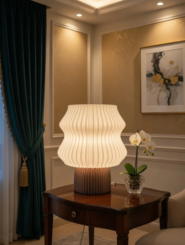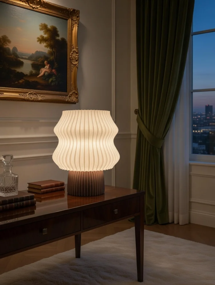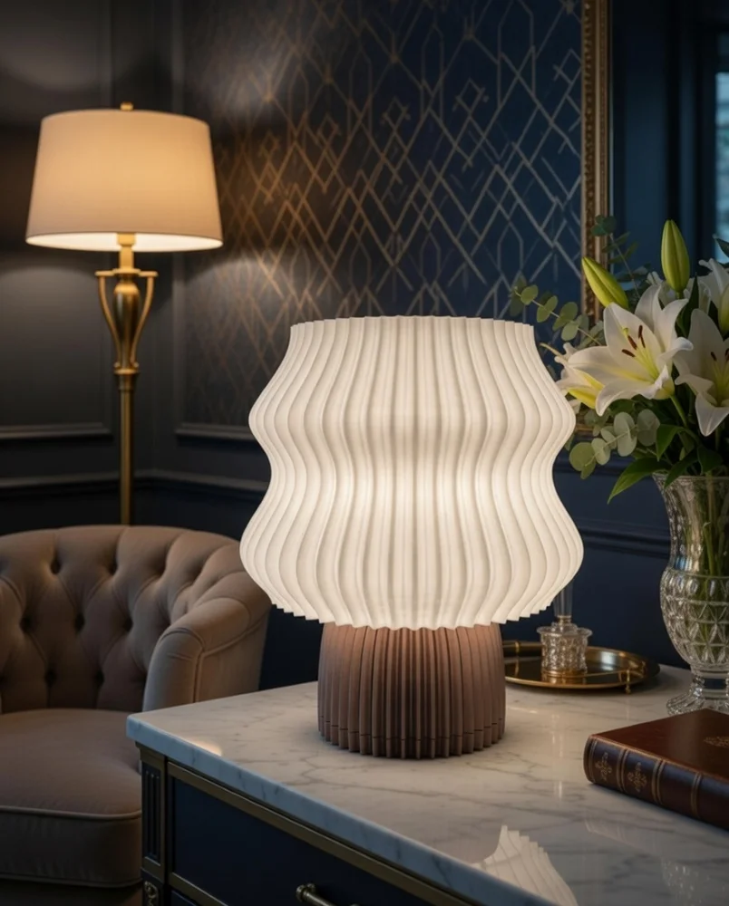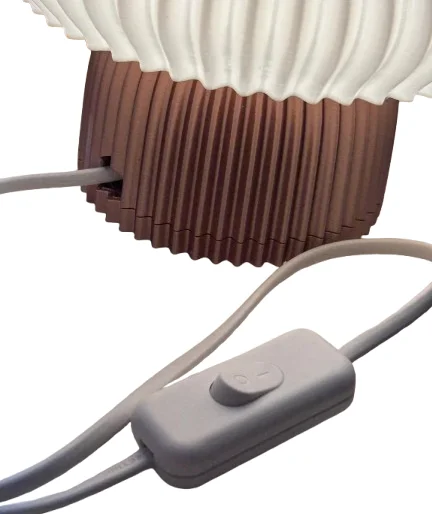 Veioză imprimată 3D cu design ondulat elegant (wave/pleated), abajur alb translucid și bază din PLA Dark Copper cald – realizată manual din materiale bio PLA. Vine cu fir de 3m, întrerupător și fasung E14 (bec LED nu este inclus). Aspect premium cupru închis, luminozitate caldă pentru ambient modern și sofisticat!